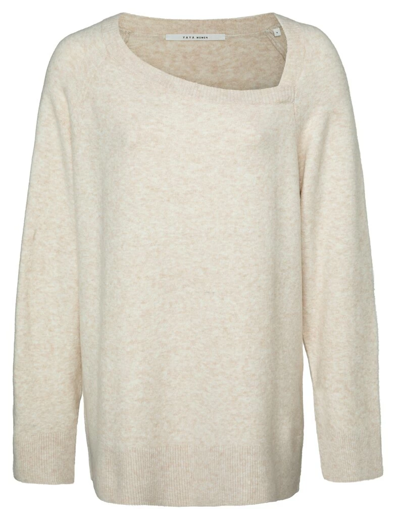 This A-symmetrical neckline sweater from YAYA is a longer length pullover, with a unique cut neckline. The neckline is ribbed and the slightly flared sleeves feature short slits.