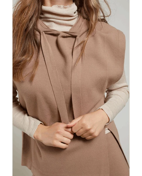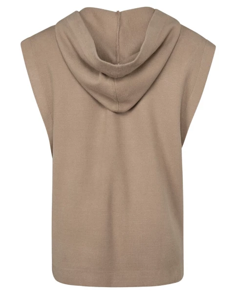 Yaya Amphora Hooded Knit, a stretchy brown knitted sweater with a hood and drawstring ties. Long in the body this straight and loose fitting pullover is sleeveless and ideal for layering. 50% Viscose, 27% Polyester & 23% Polyamide Hand wash cold XS – UK8-10, S – UK10-12, M – UK12-14 Size down if between sizes as Yaya sizes generously