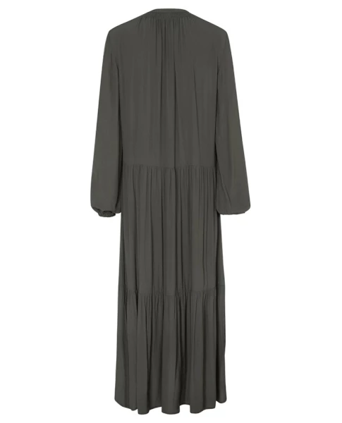 Yaya Beluga Black Tiered Dress, a dark greenish black maxi dress with long loose sleeves and a v neck which can be tied. Floaty and loose fitting the Beluga dress has a tiered skirt and a dropped waist. The long maxi dress has elasticated cuffs and the dress is crafted from an airy lightweight viscose crepe. 100% Viscose Machine wash at 30 Size down if between sizes