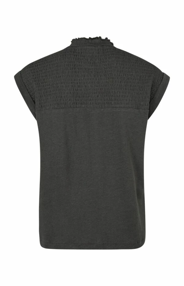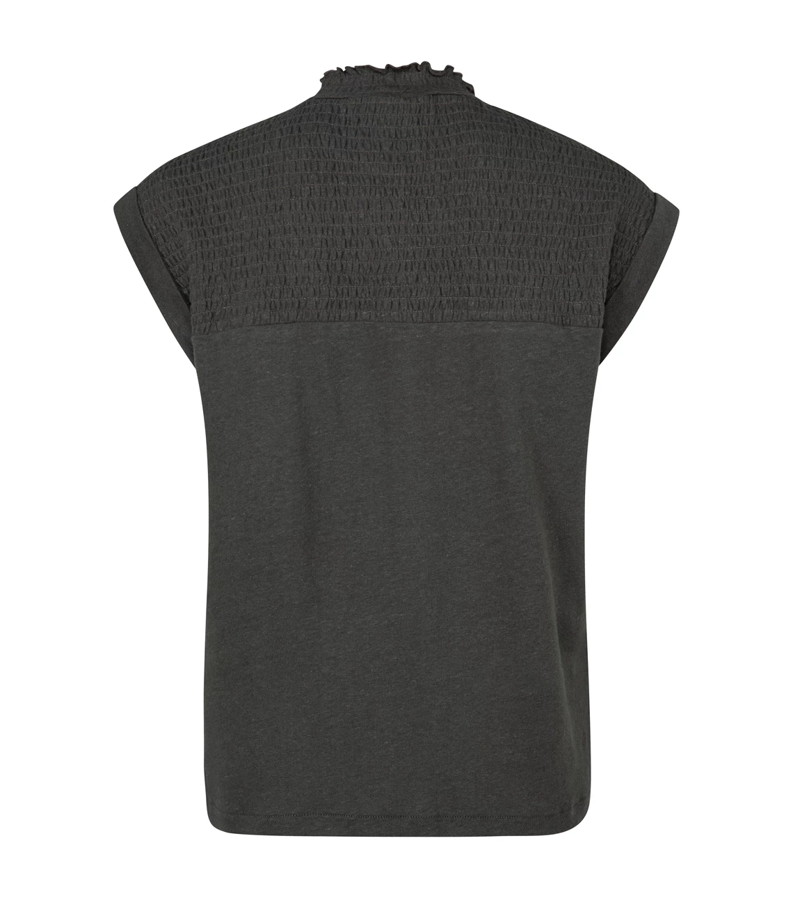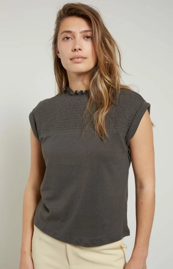 A stylish and feminine smocked top made of a fine blend of cotton and linen. The high neckline is finished off with a gorgeous ruffle detail. Perfect as part of your daily outfit paired with your favourite trousers. Style with our a ring from our SVP collection of jewellery and pop over a floral Munthe skirt for an updated smart casual look.