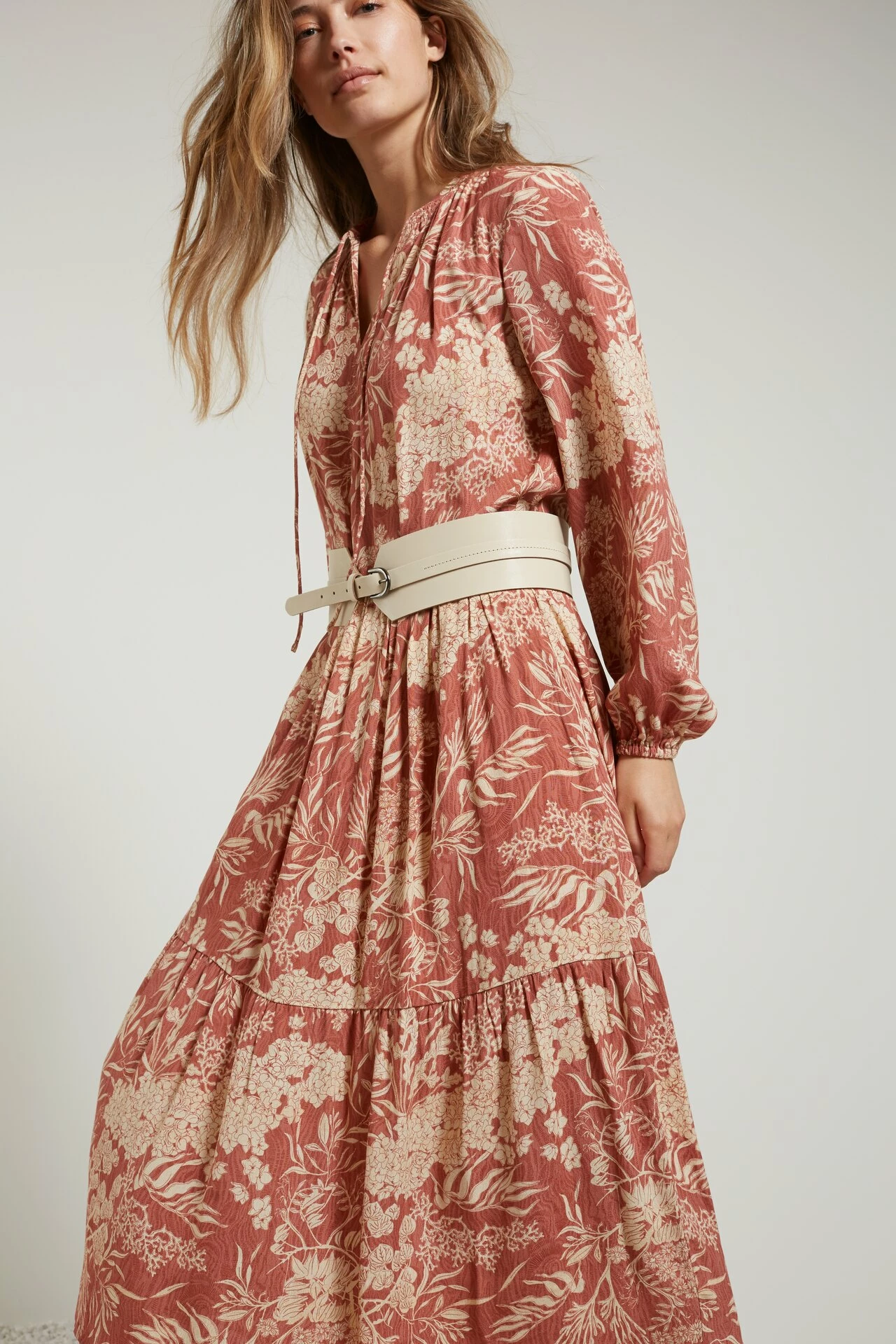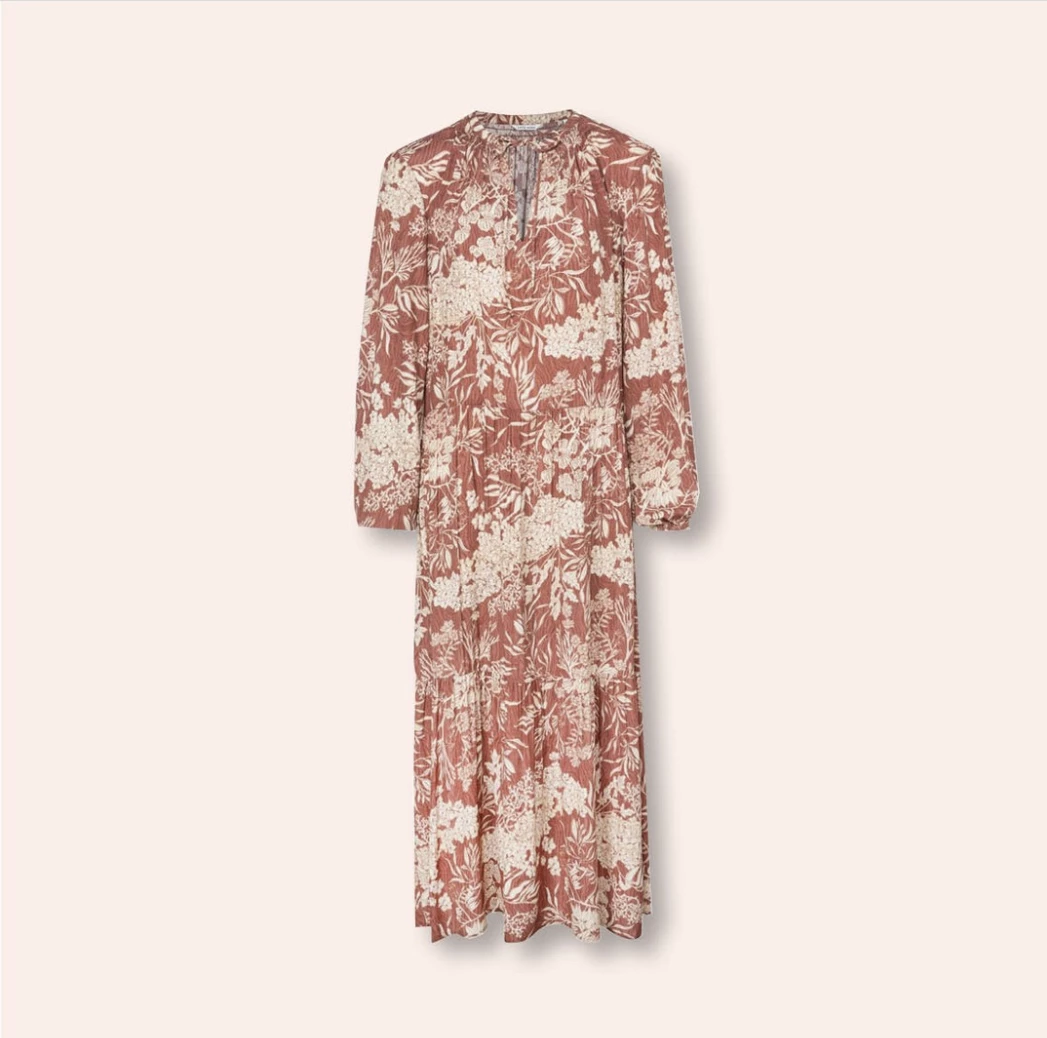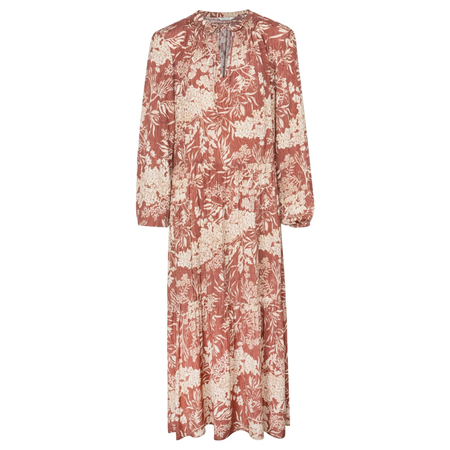 Elegant maxi dress with a cedar wood red and Brazilian sand botanical print. The dress has a V-neck and cord on the neckline. The loose fit and elastic bands at the end of the long sleeves give the dress it’s relaxed boho festival style. It also looks great pulled in at the waist with a belt. The model in the photo is 180cm tall and is wearing a size 36.