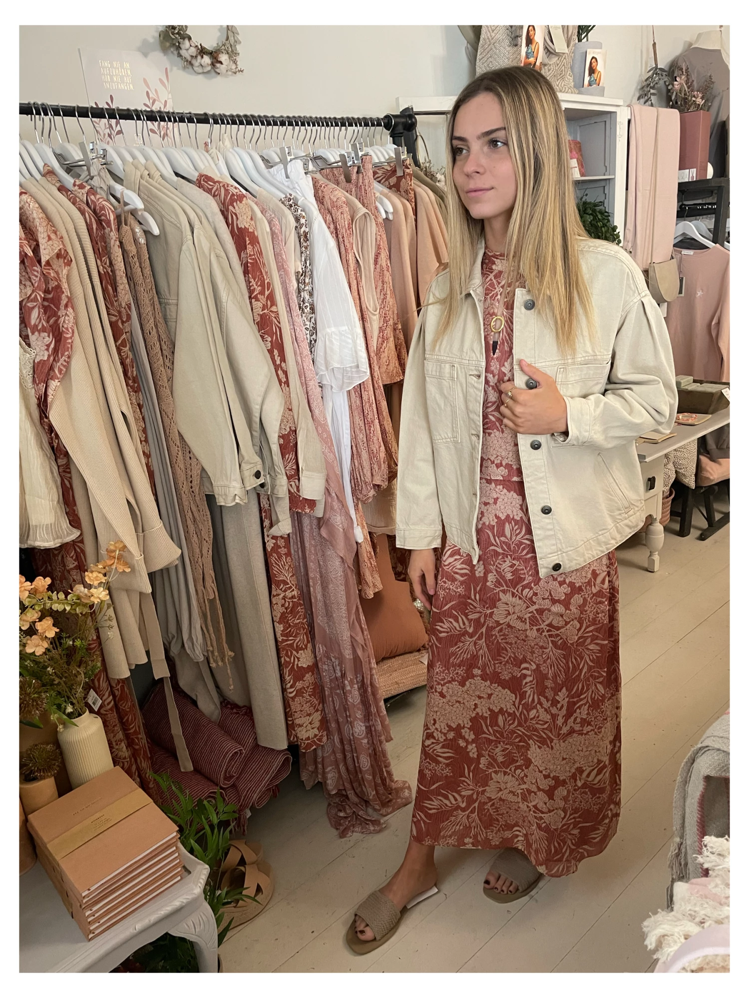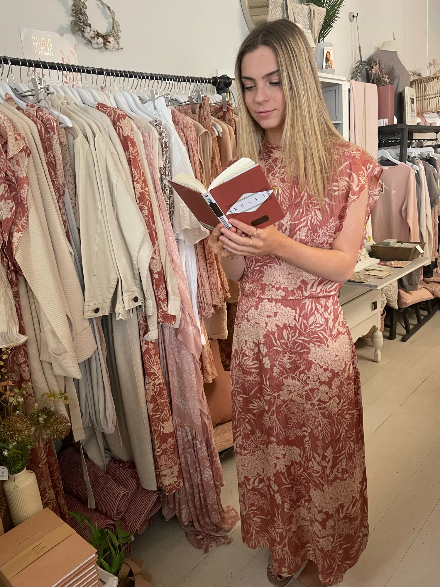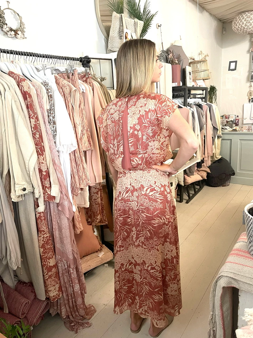 Elegant bias cut maxi dress with a cedar wood red and Brazilian sand botanical print. There is a narrow slit at the neckline and an opening at the back that reveals the plain cedar wood red fabric beneath. Fastens with a concealed zip at the back. Dress with heels and a pashmina for summer weddings or with a denim jacket and pumps as a casual outfit.