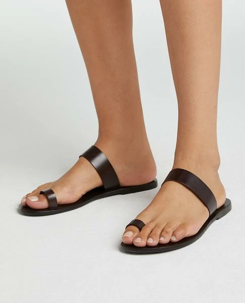 Yaya Coffee Brown Leather Sandals, a dark brown pair of flat leather sliders with leather straps across the big toe and the top of the foot. 100% Leather Wipe clean Fits true to size