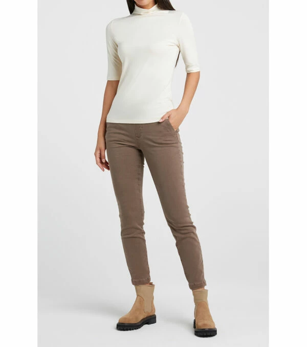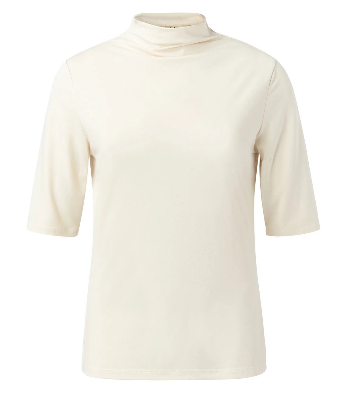 Mock neck top from Yaya. This cream top has a high neck and short sleeves. It is super soft and is fitted in style. Great for layering undershirt and knits without feeling too hot with a long sleeve.