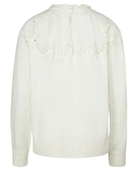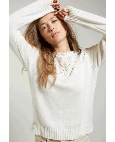 Yaya Egret Embroidered Knit, an off white knitted pullover with long sleeves ribbed cuffs. The neckline is finished with a Broderie Anglaise design and a frilly collar. 40% Viscose, 30% Polyester, 25% Polyamide & 5% Alpaca Hand wash cold and dry flat XS – UK8, S – UK10, M – UK12, L – UK14