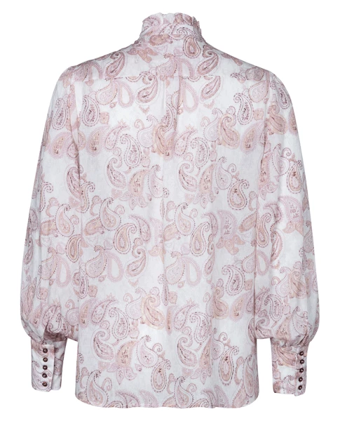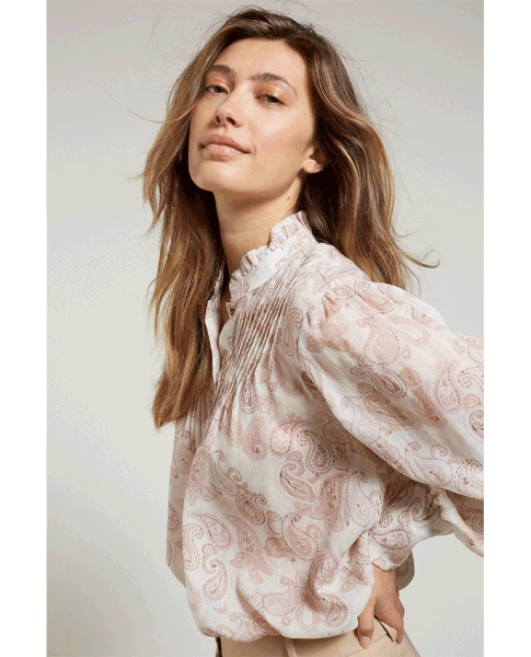 Yaya Egret Paisley Voluminous Sleeve Blouse, an off white shirt covered in a pale pink paisley print. The long voluminous sleeves fasten at the cuffs with small buttons and there are pleats on the shoulders for extra volume. A pretty and easy to wear lightweight blouse for Summer with a high frilly neck and buttons running down the front. 100% Lyocell Machine wash at 30 Size down if between sizes as this is a loose fitting blouse