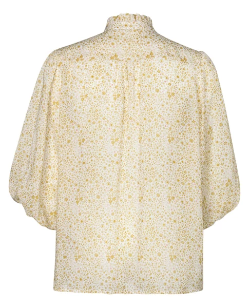 Yaya Egret Short Sleeve Blouse, a light and airy cream blouse covered in a mustard yellow floral print. Loose and floaty the Egret blouse has a row of yellow buttons running down the front, a high frilly neck and puffed 3/4 length sleeves. The chest is delicately pleated. 100% Lyocell Machine wash at 30 Size down if between sizes