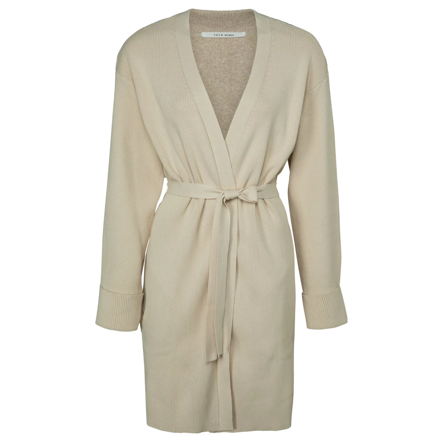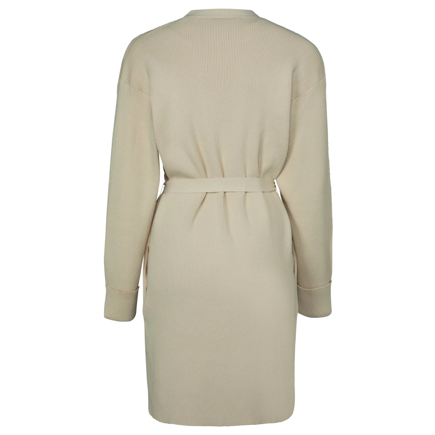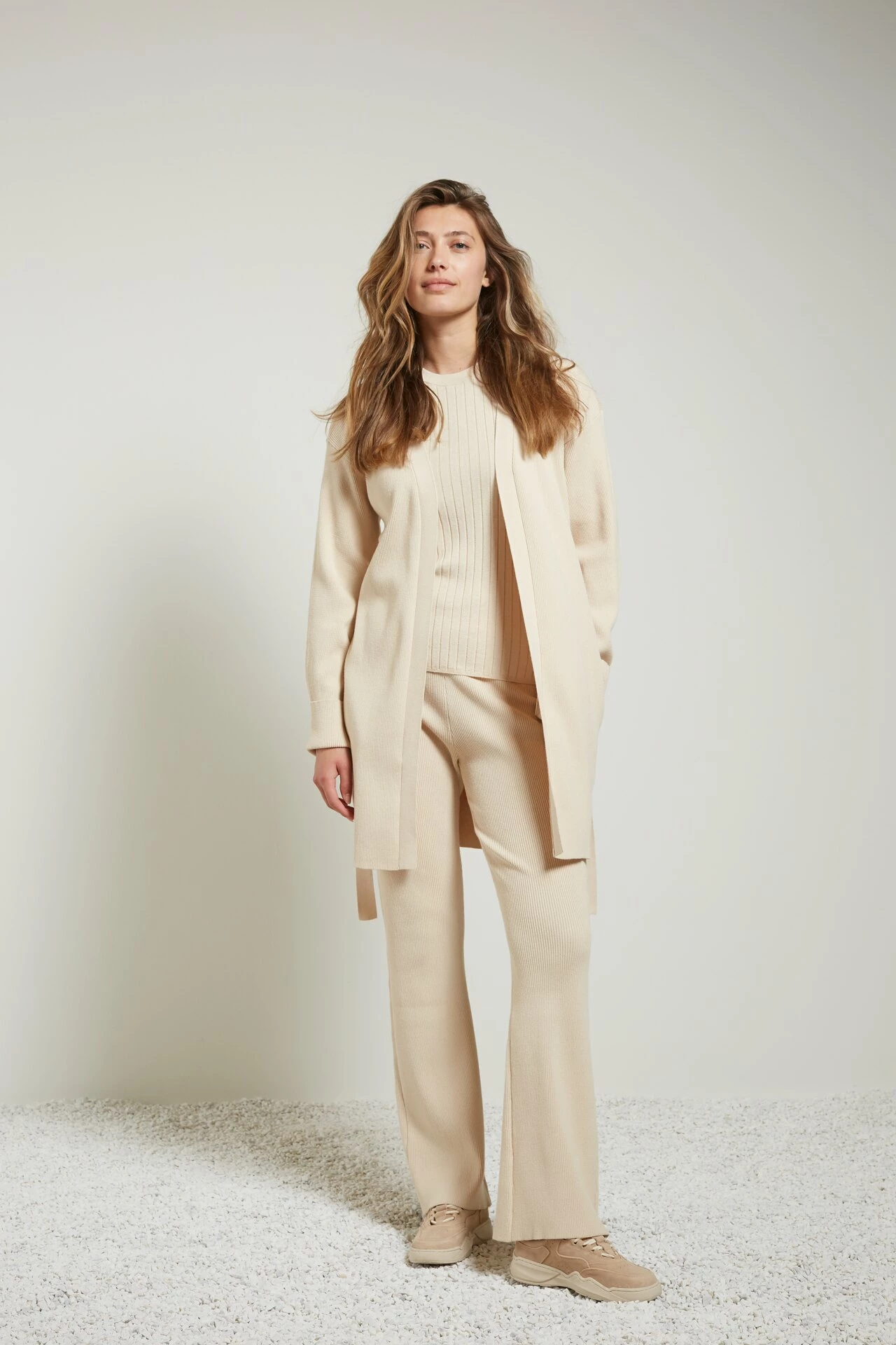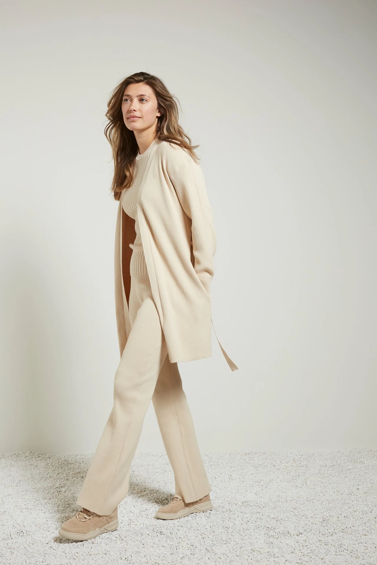 Fine knitted cardigan with belt and long rolled-up sleeves. In a lovely medium length with fine ribbed knit.