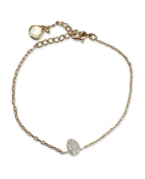 Yaya Gold Pearl Shell Bracelet, a fine delicate gold chain with a small imitation pearl charm and a golden metallic clam shell pendant hanging from the clasp. Gold Plated Brass 18cm in length