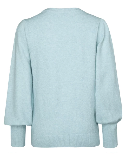 Yaya Illusion Blue Balloon Sleeve Knit, a light blue knitted pullover with long balloon sleeves and gathered cuffs. Subtly ribbed this pale blue cotton blend jumper has a round neck and fitted body. 37% Cotton. 29% Acrylic, 26% Polyester, 5% Wool & 3% Elastane Hand wash Size down if between sizes as this is a loose fitting jumper XS – UK8, S – UK10, M – UK12, L – UK14