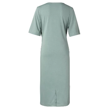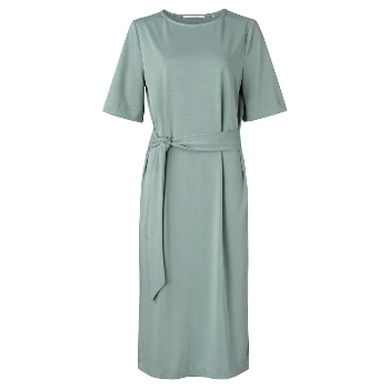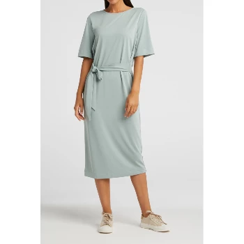 The Jersey dress from YAYA is a midi jersey dress with kimono sleeves. The dress features a knotted strap at the waist and small slit on the back.