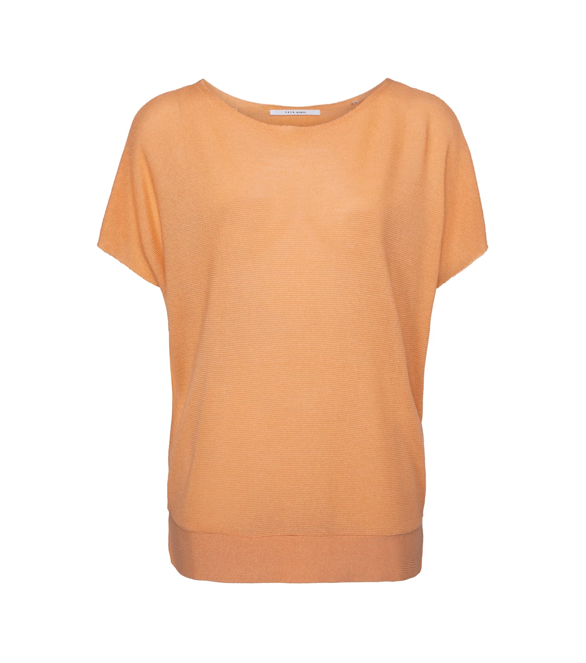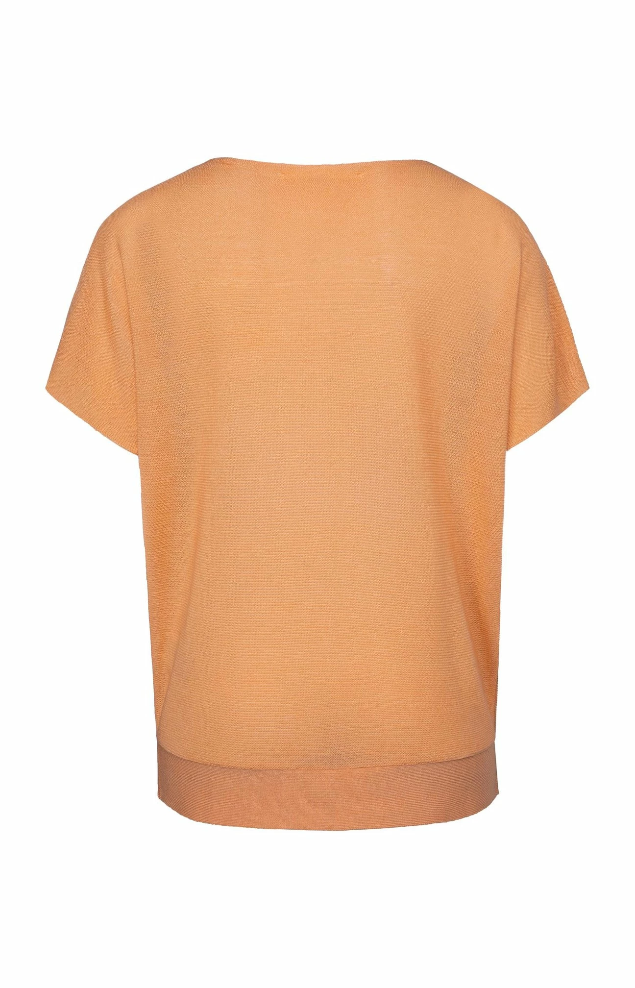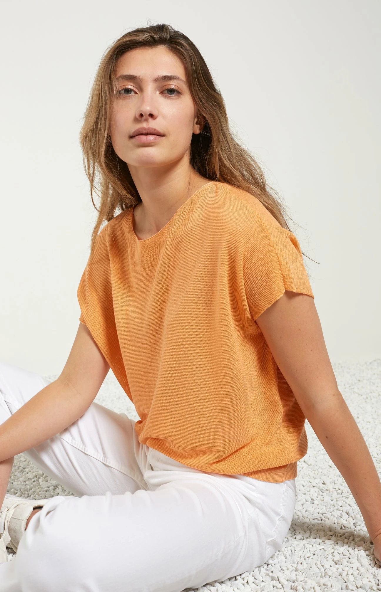 Rib detail sweater in orange by yaya. Sweater with rib detail stitch with a pretty elegant boat neck. The waistband combined with the jaunty short sleeves. Features: quality composition: 67% lyocell, 33% silk. Boat neck. Short sleeves. Fit: relaxed.