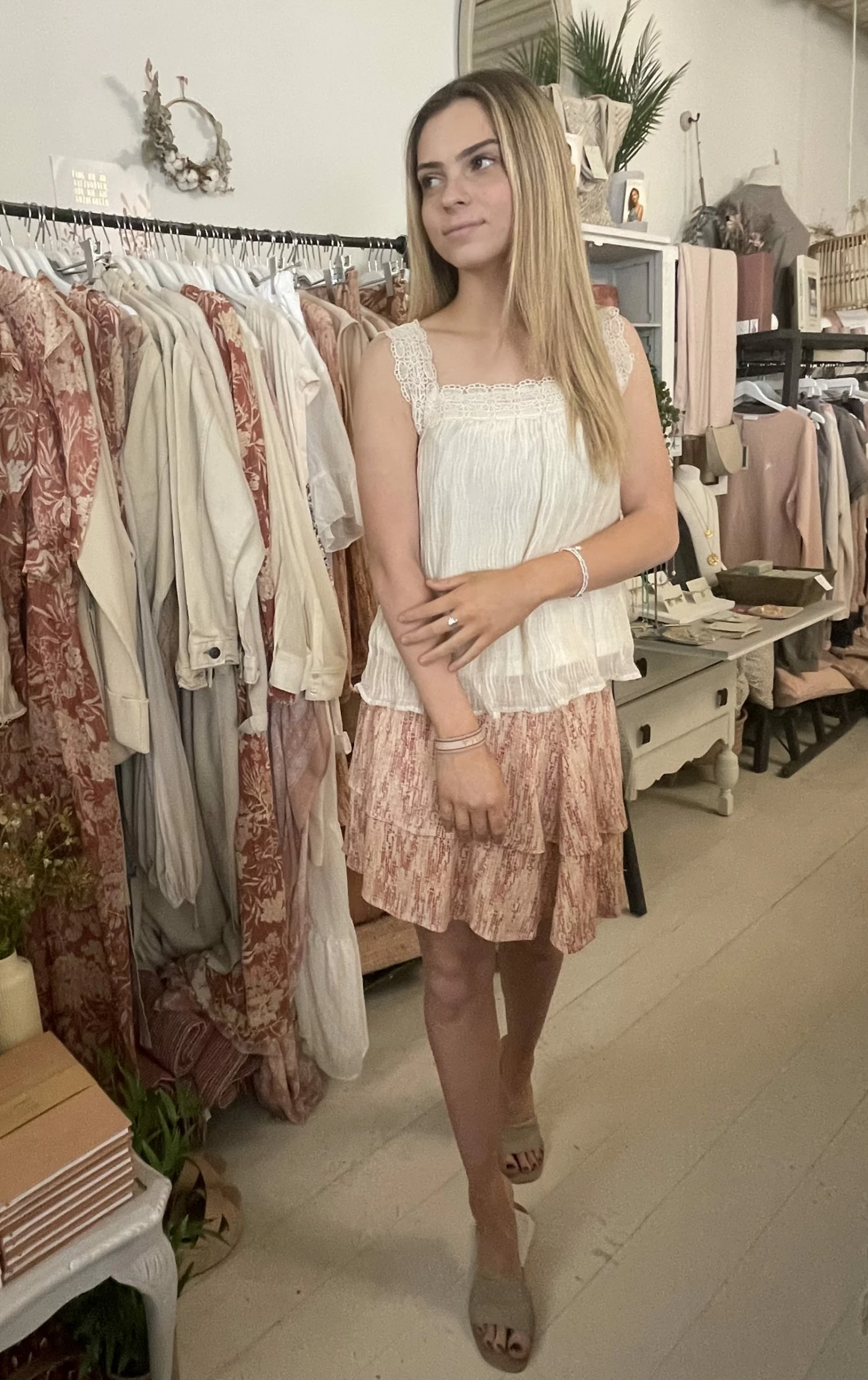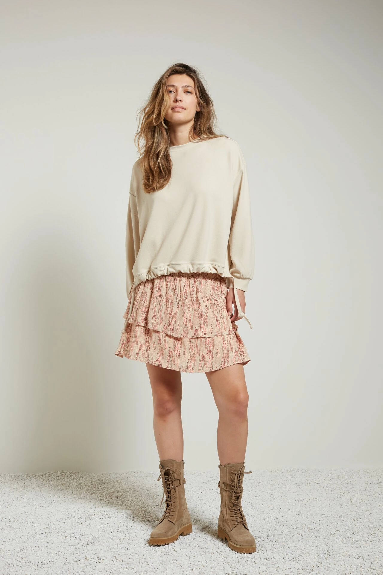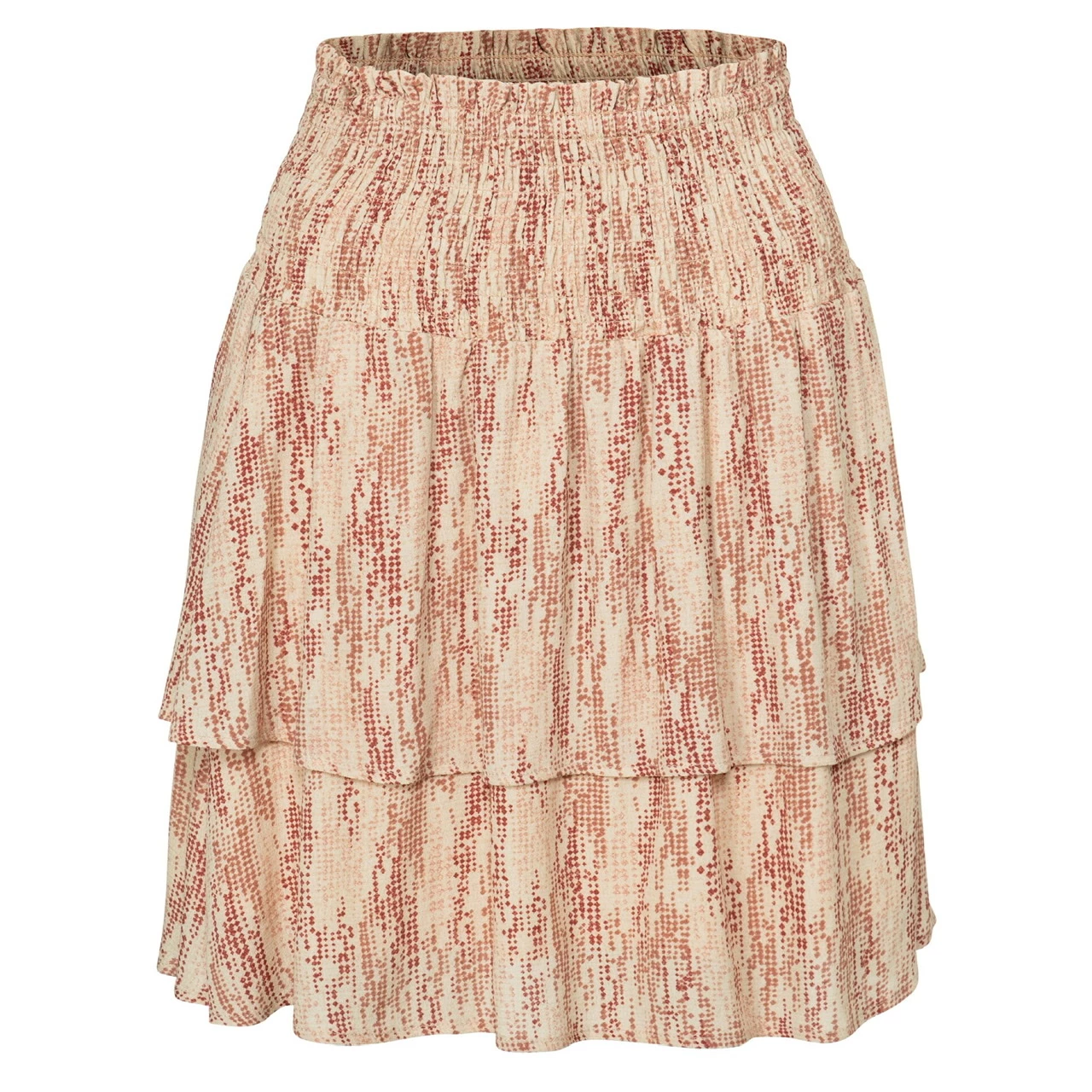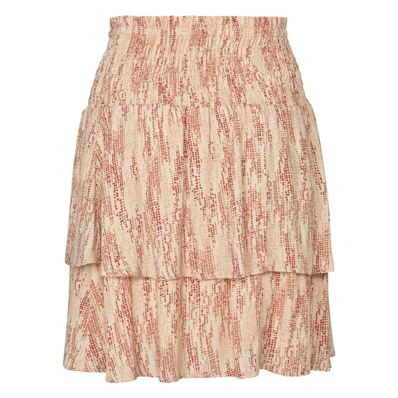 Flowy short skirt made from viscose with a unique print and soft touch inner skirt. The smocked waist and narrow elastic at the waist add elegance to the design. The model in the photo is 180cm tall and wears a size 36.
