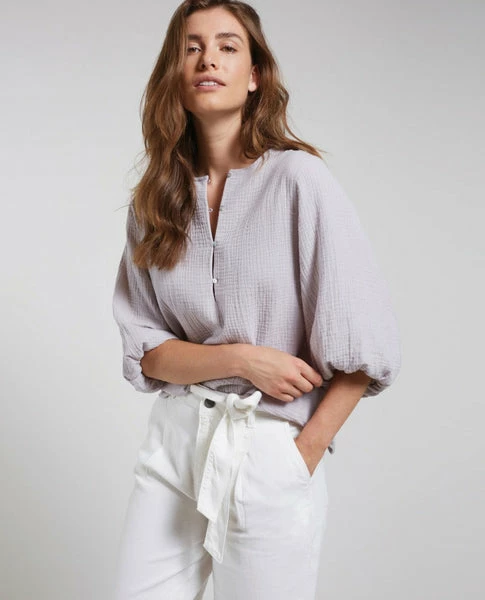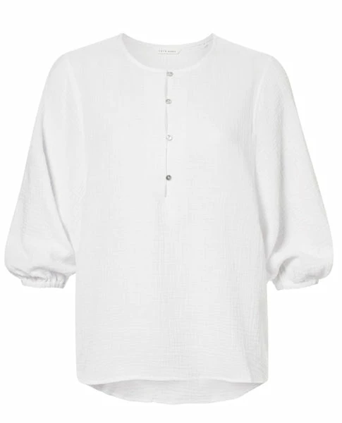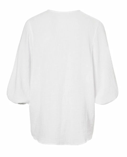 Yaya Pure White Button Top, a light cotton blouse with loose fit and three-quarter length sleeves. Button fastening to centre front with simple round neck detail and crinkled texture finish. 100% Cotton EU34 UK6, EU36 UK8, EU38 UK10, EU40 UK12 Model is 175cm and wears a Size 36