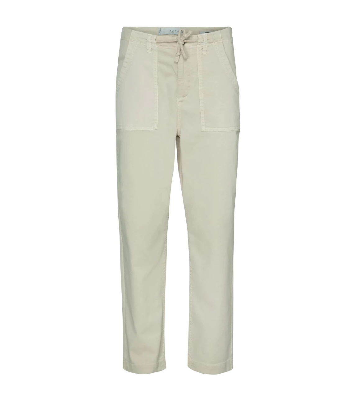 This cargo chino is crafted from a cotton blend and has a cord to easily adjust the waistband for a comfy yet flattering look. Pouche pockets add a playful finish to this casual look. Pair with Yaya top and a jacket for a cool and feminine day outfit.