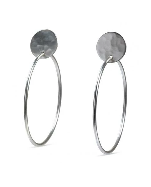 Yaya Silver Embossed Hoop Earrings, a metallic silver pair of dangling hoop earrings with hammered metal ear studs. Also come in gold. Silver Plated Brass 5.5cm