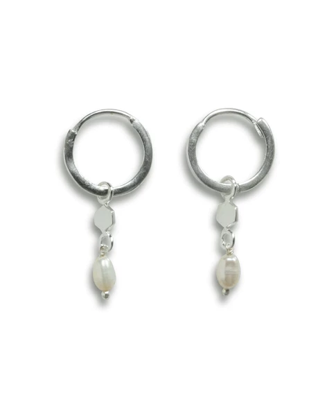 Yaya Silver Small Hoop Earrings, a small pair of silver metal hoop earrings with small pearl bead pendants. Silver plated brass