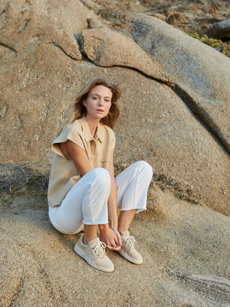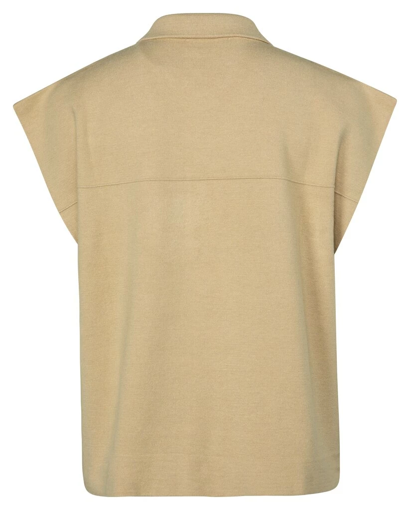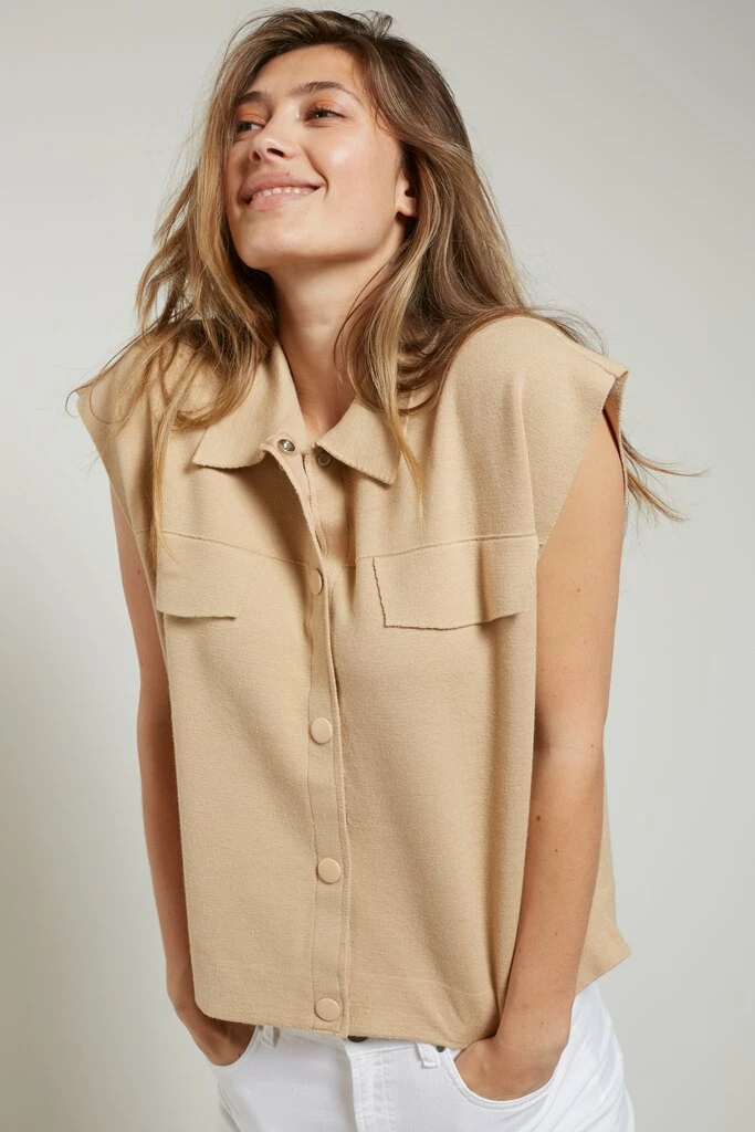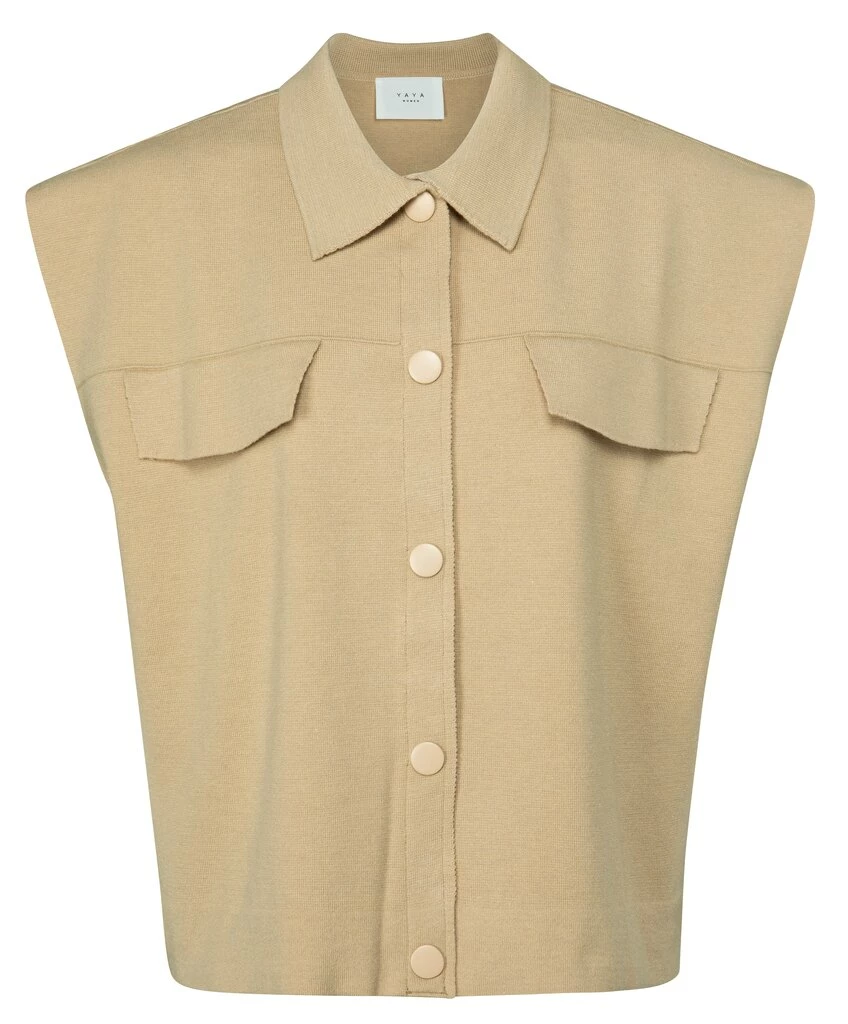 The sleeveless cardigan from YAYA is a creamy shade with press studs and firm and a soft-touch fabric. With imitation pockets on the front, giving this boxy-fit cardigan a playful look.