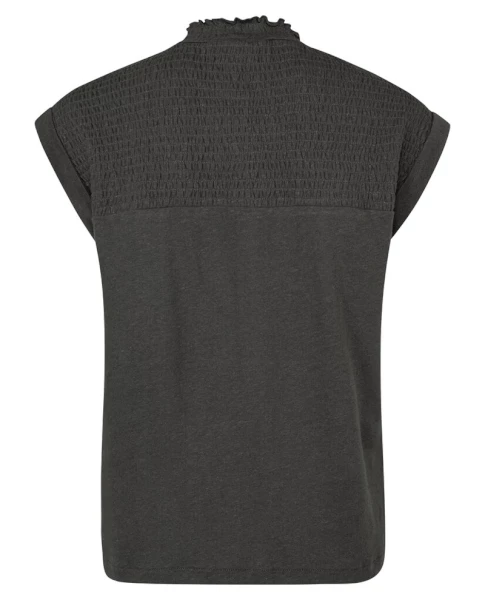 Yaya Smocked Black Top, a washed black linen blend tee with a high frilly neck and short capped sleeves. Designed with a stretchy smocked neckline and shoulders this vintage black t-shirt has a straight and loose fit. 55% Linen & 45% Cotton Machine wash at 30 XS – UK8, S – UK10, M – UK12, L – UK14 Size down if between sizes