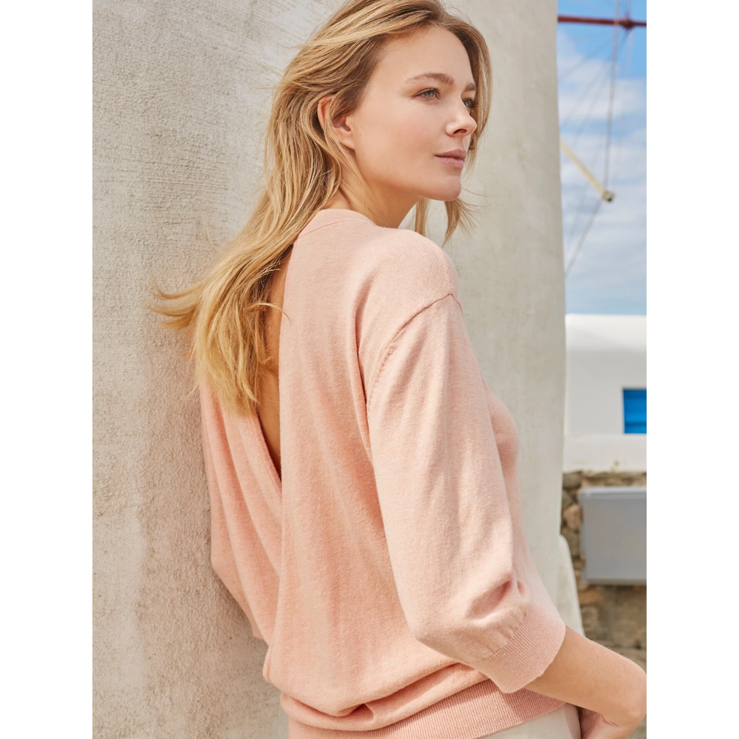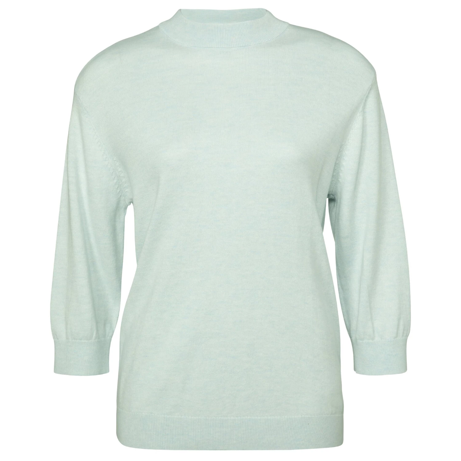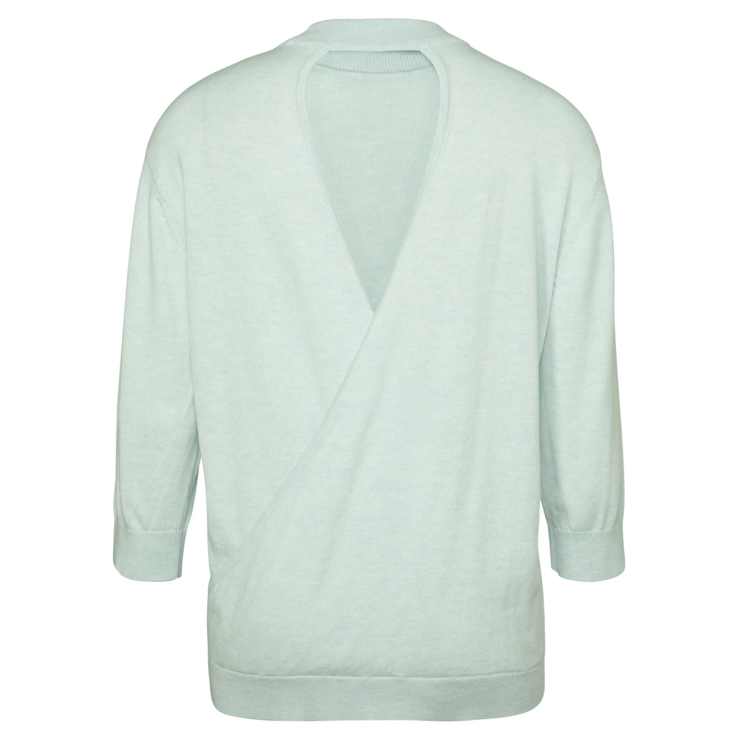 The loveliest sweater with a high round neck and 3/4 sleeves. We particularly love the relaxed open fit back with overlap. In this season’s fresh and vibrant colour – illusion light blue.