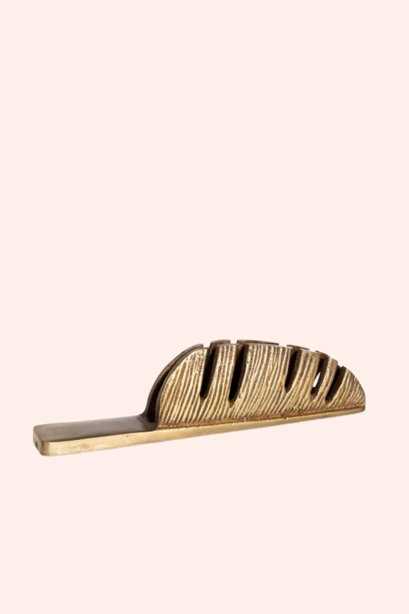 Brass coloured photo holder Tropical leaf shape Size: Width: 2cm / Height: 4cm / Length: 15.5cm Material: 100% Aluminium