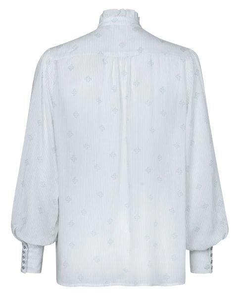 Yaya Vanilla Ice Blouse, a white loose fitting shirt covered in a small blue floral print and subtle stripe. Finished with long voluminous sleeves an pleats across the chest and shoulders this lightweight Summer shirt has gathered cuffs with buttons. 100% Lyocell Machine wash at 30 Size down if between sizes as this is a loose fitting blouse